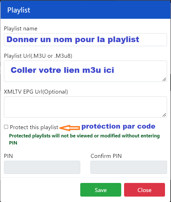 5 – Voici comment intégrer votre lien m3u si vous cliquer sur +Add Playlist